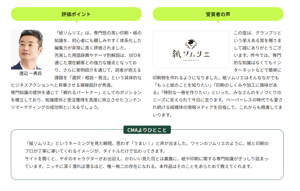 今回の受賞では、印刷・紙に関する専門知識を、初めての方にも親しみやすく整理して伝えている点や、用語解説・テーマ別記事・実例紹介を通じて、読者の課題解決から相談・発注へとつなげる導線設計が高く評価されました。